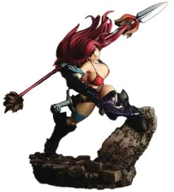 Even in a bikini, Erza is always ready for battle and comes holding a long halberd and a dragon claw-like spear in the other, equipped with arm and leg armor—all beautifully textured and painted. Her rock-like base features cracks under her feet to give you an idea of just how strong she is.Â