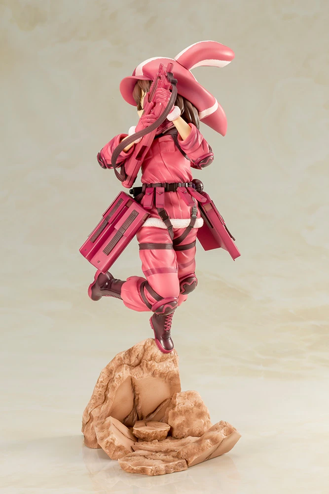 A KOTOBUKIYA Japanese import! The next incredible Ani*Statue from Kotobukiya comes from the Sword Art Online spinoff anime series Gun Gale Online. Of course, it’s none other than the show’s main character and the alter ego of real world Karen, LLENN! After taking an interest in online games the tall young woman hit upon Gun Gale and created her iconic avatar that takes the form of a short girl in all pink clothing, and that’s exactly how she appears here! Llenn is captured in a truly dynamic pose, leaping off of a pile of rubble in a desert zone with only part of one foot connecting the girl to her base. The online avatar is dressed in her signature pink combat outfit consisting of matching shirt, cargo pants, short boots, and long-eared knit cap, while a combat knife and tons of pouches and extra ammunition are placed strategically on her person. Her pink clothing gives Llenn camouflage in the reddish terrain, and as a player who specializes in fast-paced close combat she is able to perform such an energetic jump as she moves swiftly to dodge an attack. The gamer would never be caught without her beloved P90 P-Chan, and she wields the pink personal defense weapon in both hands. Sculpted by Hirotoshi Nakamura and Shigeo Mouri, Llenn is nearly 10 inches tall (1/7 scale) leaping into the air atop her detailed georama base. Llenn looks amazing whether she’s displayed on her own or alongside other Sword Art Online Ani*Statues in your collection!