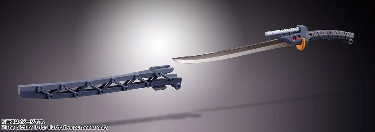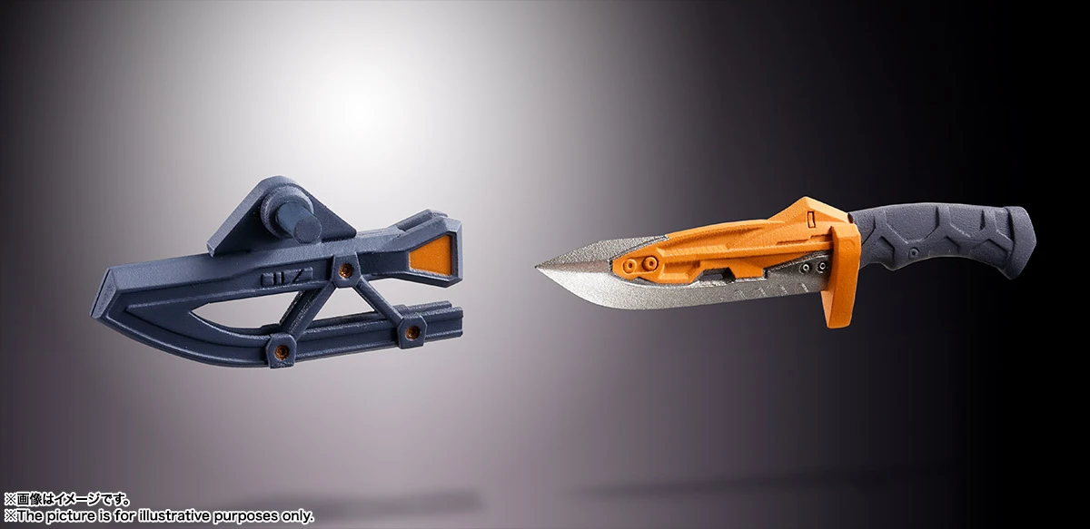 The set includes four pairs of optional hands, a Progressive Knife, a Magoroku Exterminate Sword, a Pallet Rifle, a handgun, a Pallet knife full option, an umbilical cable, a mounting joint, an optional head with goggles, shin armor, a support rod, and a display stand with cage.